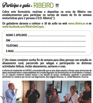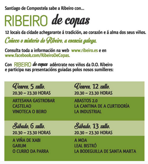 Del 4 al 14 de julio, un total de 12 destacados establecimientos de la ciudad compostelana ofrecen una amplia gama de vinos de la Denominación de Origen Ribeiro con más de 50 marcas para degustar en copa o botella, y todos los clientes que disfruten con ellos participarán en promociones especiales. Otros atractivos para los clientes serán los regalos directos o los sorteos de estancias de turismo en la Ruta del Vino del Ribeiro, con un completo fin de semana lleno de actividades en torno a los vinos y la oferta lúdica del Ribeiro.