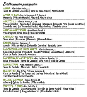 El listado de establecimientos compostelanos participantes en el Ribeiro de Copas 2013 lo forman en la zona vieja O Beiro, Abastos 2.0., A Moa, Garum y O Curro da Parra; y, en la zona nueva, La Bodeguilla de Santa Marta, Bistró Bar Leal, La Cantina de la Curtidoría, Tapería Castelao, Artesana Gastrobar, La Industrial y A Viña de Xabi. En ellos, los consumidores podrán descubrir una amplia gama de vinos y elaboraciones de la Denominación, tanto blancos como tintos.