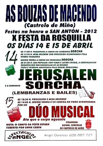 El sábado 14 y el domingo 15 de abril se celebra en As Bouzas de Macendo la 10ª edición de la Fiesta de la Rosquilla. En la cena que tendrá lugar el sábado 14, antes de las afamadas rosquillas de As Bouzas elaboradas artesanalmente por los vecinos y vecinas, se degustarán alubias y lacón cocido.