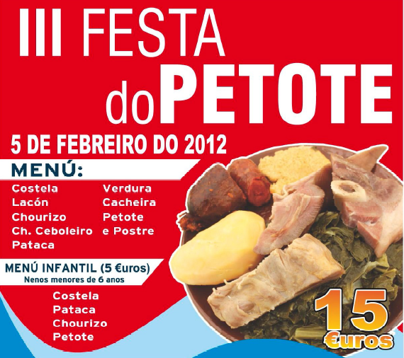 Y a la 13:00 comenzará la fiesta gastronómica del Petote, en el pabellón de Carballedo con la lectura del pregón por parte de Xacobe Pérez. A las 14:00 se servirá el petote acompañado de los tradicionales sabores del cocido, elaborado por A Raxadal, Casa Inés, A Eira da Vella, O Casal, Casa Blanco y A Portela do Mirador. Despues puedes degustar el postre tradicional elaborado por Casa Vilalén y O Bergando. En el recinto encontrarás artesania, requesón de Corrredoira, filloas de Valongo, rosquillas y galletas caseras, artesanía tradicional de la zona, elaborar tu propio petote y muchas otras ofertas que degustar. La Jornada estará amenizada por la Charanga Charandonga de Tenorio y el grupo Catro Ventos. Los mas pequeños podrán disfrutar de los hinchables en la sobremesa. Fuente: facebook y concello Cotobade |